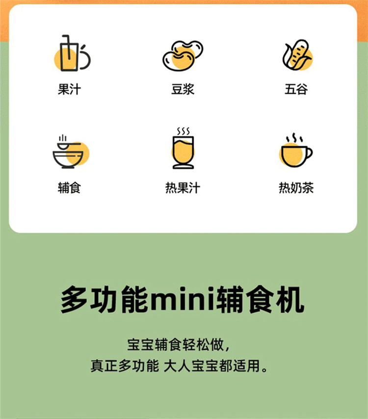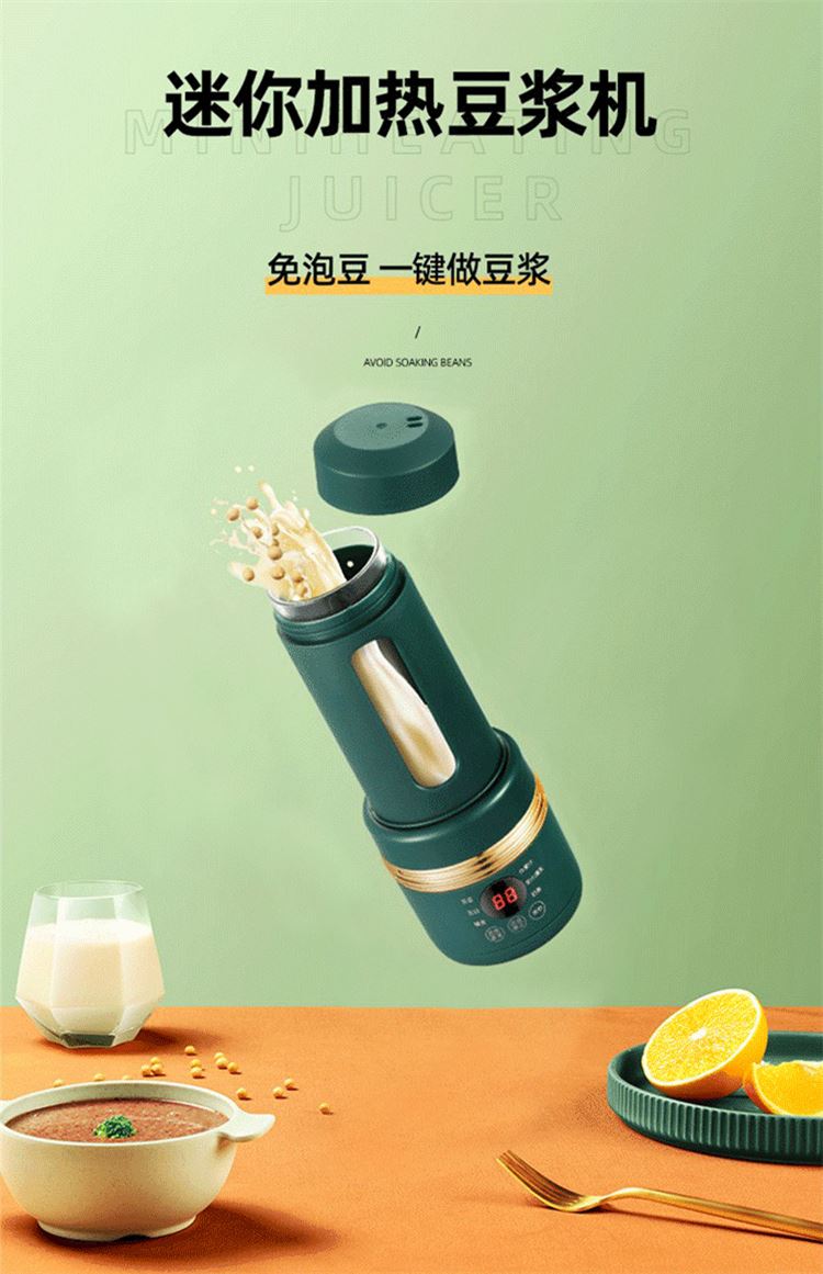 加热功率:300W 搅拌功率:150W 颜色:翡翠绿 产品毛重:450g 包装尺寸:27*9.5CM 包装明细:主机+电源线+清洁刷+说明书 条形码:6975116743704 1. 25分钟速成豆浆全自动工作,免泡干豆/湿豆直接打豆浆,快速破壁无渣豆浆免滤直接喝,多段曲线智能熬煮,打造丝滑口感。2.低能耗低功率不跳闸,宿舍也能用。400ml精致容量1-2人私享,冷热两用,冬天喝上暖胃,果汁加热到45°C刚好入口不伤胃。噪音小工作不打扰。
