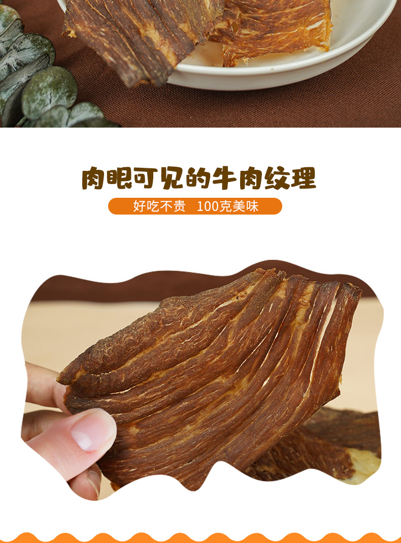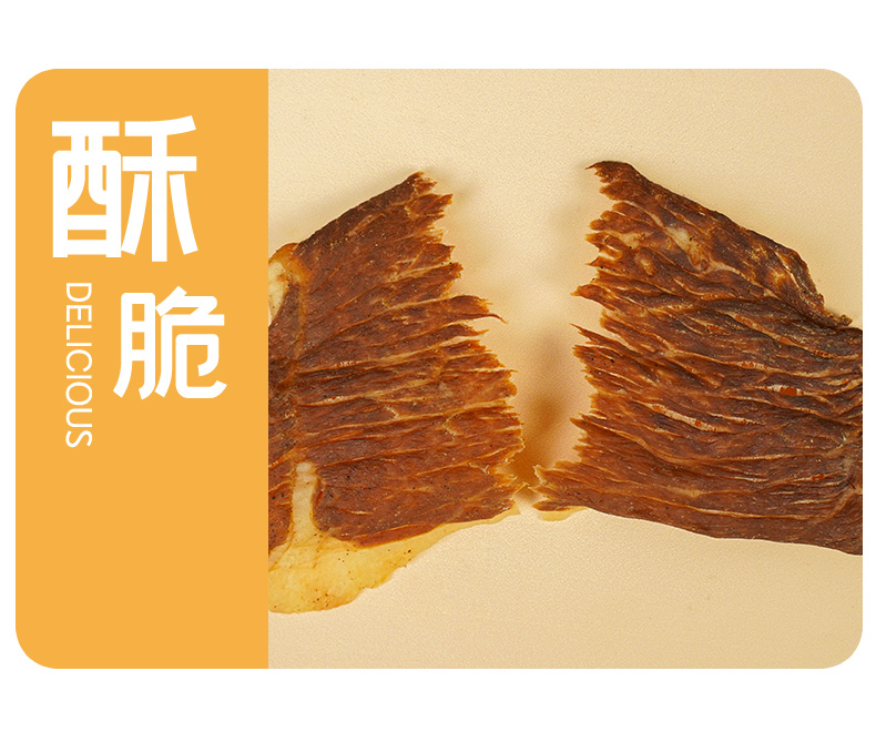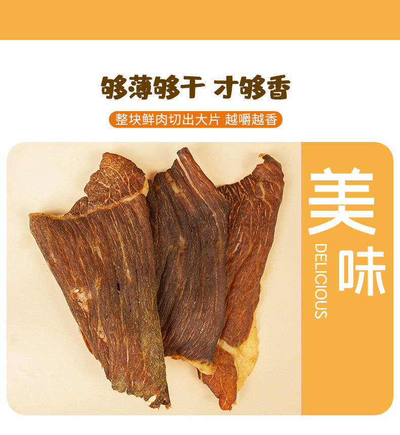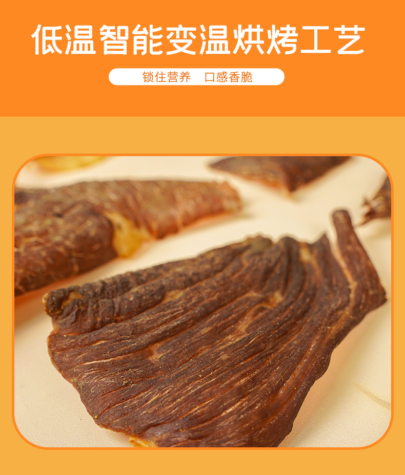 原切整片肉,鲜烤薄脆,肉眼可见的牛肉纹理,低温智能变温烘烤,锁住营养,口感香脆。