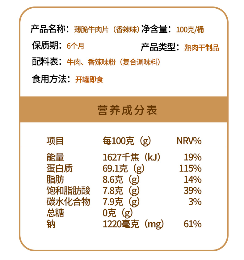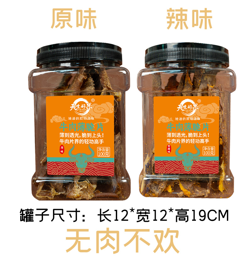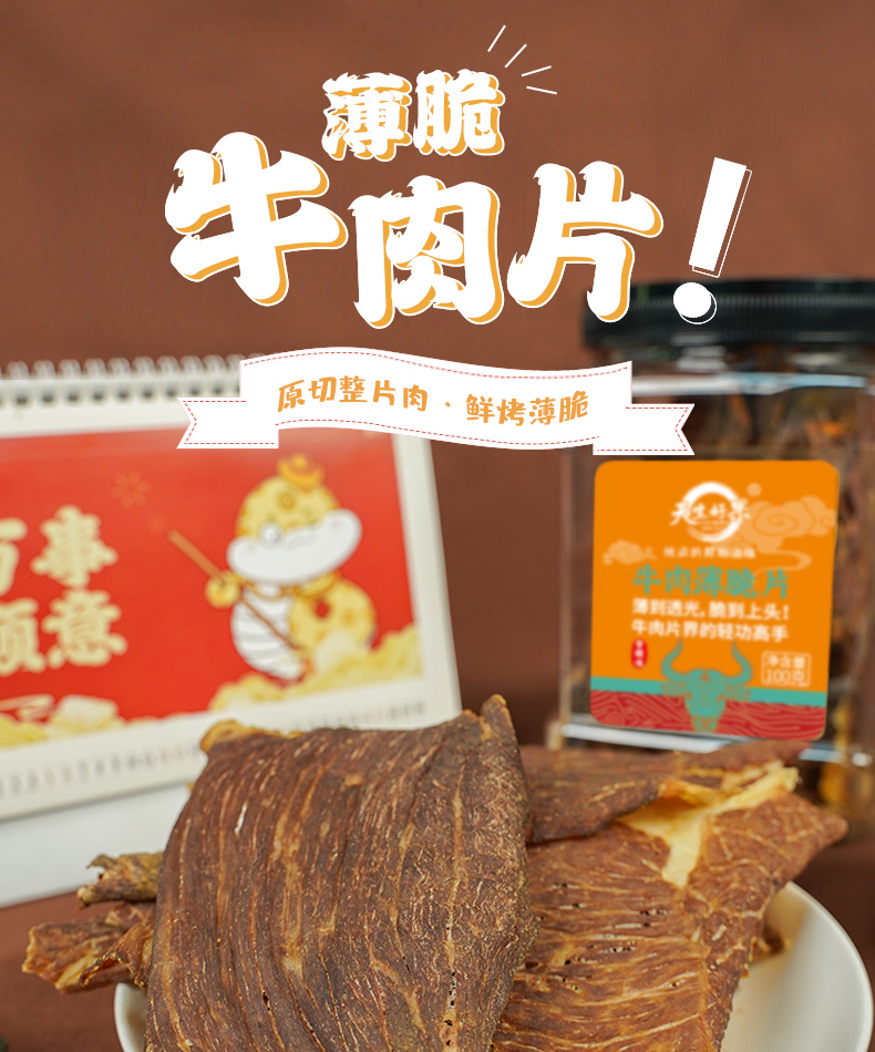 原切整片肉,鲜烤薄脆,肉眼可见的牛肉纹理,低温智能变温烘烤,锁住营养,口感香脆。